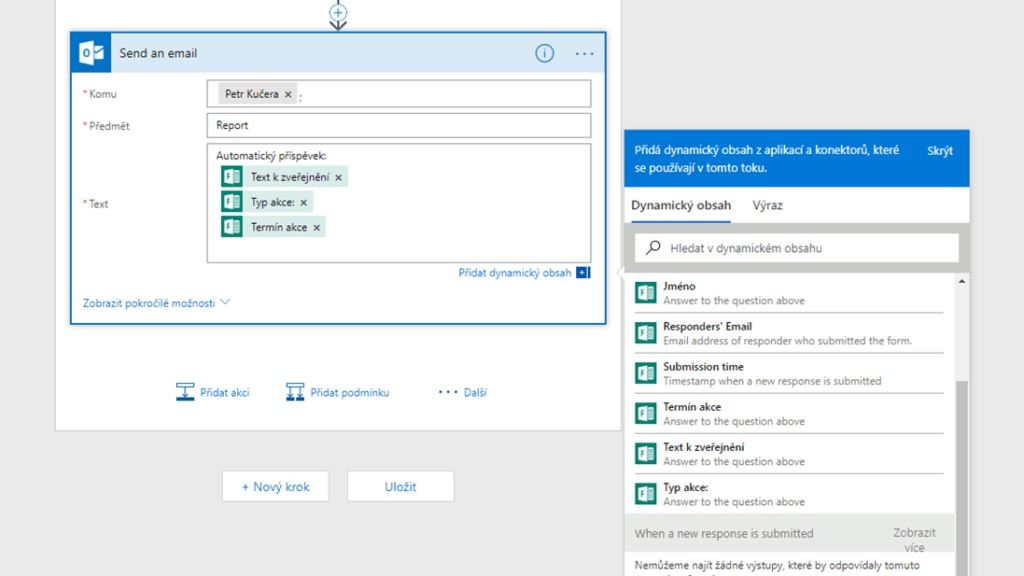 - Info přímo do e-mailu – nechte si odesílat informace z formuláře přímo do Vašeho e-mailu, docílíte toho tak, že v Power Automate v kolonce Text přidáte dynamické prvky z formuláře (viz obrázek) a na tyto e-maily pak můžete aplikovat pravidla