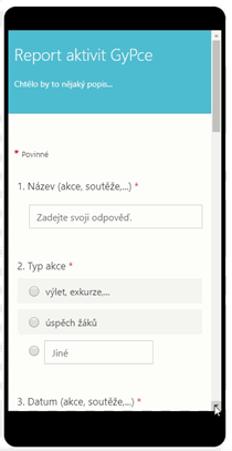 V ní máte možnost přidávat různé typy otázek, jako jsou volba, text, hodnocení, datum a další. Pokud vidíte Microsoft Forms poprvé, určitě doporučujeme přečíst si i naši sérii Využití Microsoft Forms ve školství. Pro tento formulář asi nejvíce využijeme volbu, text a datum. Nyní je na Vás, abyste se rozhodli, jaká data budete chtít sbírat, a podle toho vytvořili dané otázky. Jako příklad uvedu strukturu, kterou jsem vytvářel pro svou školu.