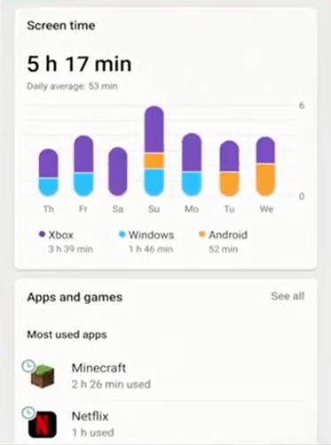 Při kliknutí na každého člena se také můžeme podívat, kolik času na kterých zařízeních nejčastěji tráví. Týdenní sestavy aktivit mohou chodit i na naši e-mailovou adresu. Aplikace je schopná sledovat aktivity a nastavovat limity jak na Xbox a Windows 10, tak také na Android zařízeních, což je její obrovská výhoda. Proto bude mít větší využití pro uživatele těchto operačních systémů.