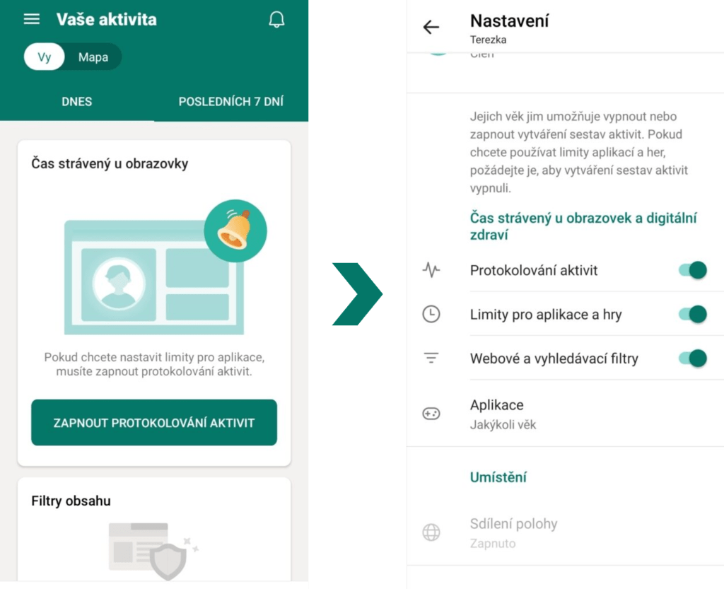 Jednou z velmi často poptávaných funkcí rodičů je regulace času u obrazovky nebo omezení aplikací. A je to celkem logické. Proto také jde o jednu z hlavních funkcí této aplikace. Organizátor může členům domácnosti nastavovat různé limity, na které se teď podíváme. Je to jednoduché. Na začátku povolíme protokolování aktivit. Pak stačí jen vybrat rodinného příslušníka na výchozí obrazovce a kliknout na ozubené kolečko vpravo nahoře nebo na tlačítko Nastavit omezení, kde povolíme jednak Protokolování aktivit a pak také Limity pro aplikace a hry. Je potřeba, aby bylo protokolování aktivit spuštěno i na zařízení dítěte. Na stejném místě lze také nastavit filtr na webové vyhledávání nebo věkovou hranici pro spuštění různých aplikací.