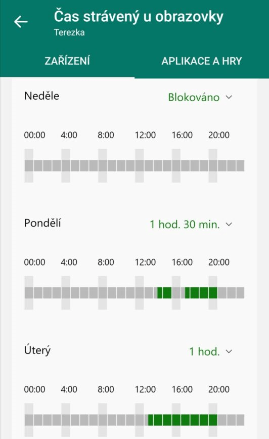 Nastavovat limity můžeme buď zvlášť jednotlivým aplikacím a zařízením, nebo všem věcem najednou. Xbox nebo Windows 10 nalezneme na záložce Zařízení, mobilní aplikace na záložce Aplikace a hry. Stačí zvolit zařízení, které chceme omezit. Nejprve u každého dne určíme, jaký čas může člen používáním strávit, poté intervaly, kdy může tato zařízení používat. Toto zajistí, že dítě nebude hrát hry dopoledne místo školy, ale až splní všechny své povinnosti, což se během distančního vzdělávání může hodit ještě více než jindy. Microsoft Family Safety se dokáže přizpůsobit i různým časovým intervalům, které se mohou každý den lišit. Obecným doporučením je nastavit 2 až 5 hodin pro mimoškolní aktivity. Jak lze vidět, prostředí je opravdu intuitivní: