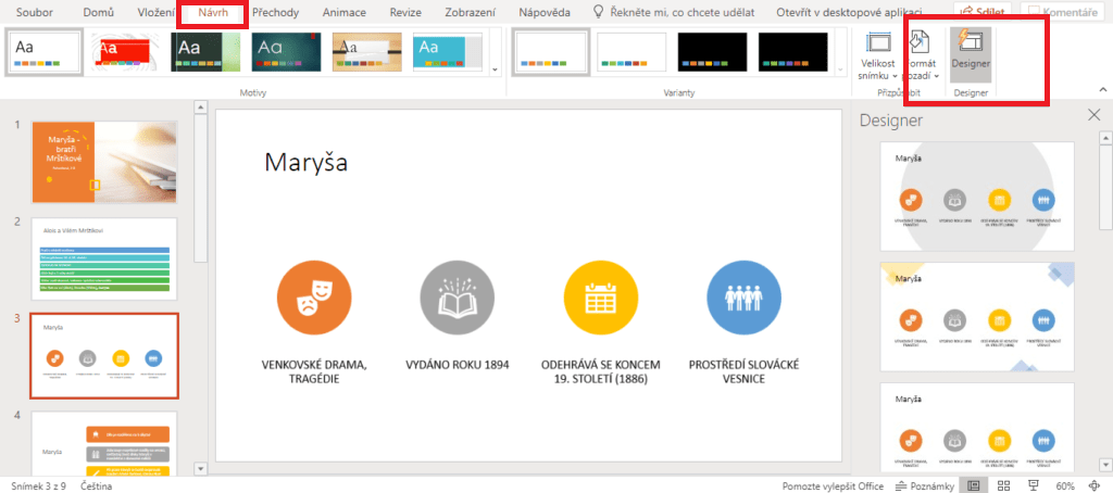 Nejste dobří v návrhu prezentace? Nevíte, jaké barvy k sobě ladí nebo jakou infografiku použít? Stačí si připravit pouze text a zbytek udělá umělá inteligence za vás. Funkce Designer nebo Návrhy designu se nachází v kartě Návrh. Designer vám poskytne spoustu možností, jak rozložit obsah na snímku, navrhne barvy, druh a velikosti písma a mnoho, mnoho dalšího.
