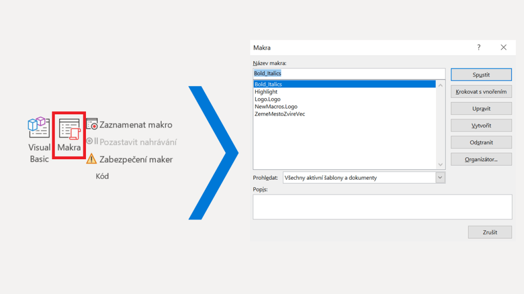Druhou možnost použijeme, pokud bychom chtěli, aby makro fungovalo pouze v tomto dokumentu. - Můžeme přidat popisek, co dělá - může se hodit, pokud máme maker více.