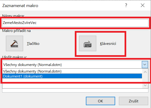 - V kolonce Uložit makro v: vybereme jednu z možností - buď Všechny dokumenty (Normal.dotm) nebo název dokumentu, ve kterém jej vytváříme (dokument).