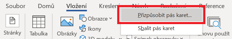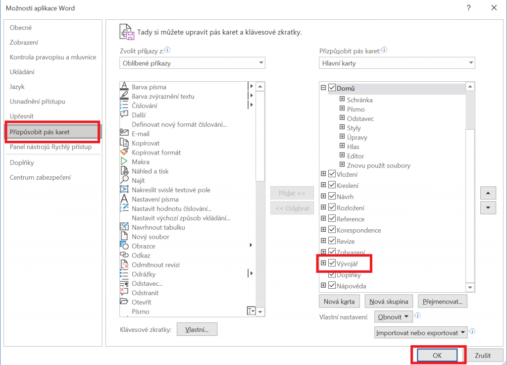 Pokud ji tam nemáte, musíte ji přidat. Lze ji připnout do všech výše zmíněných aplikací. Uděláme to tak, že klikneme na kteroukoli z karet pravým tlačítkem myši a vybereme Přizpůsobit pás karet... Vyskočí na nás okno Možnosti aplikace Word (v tomto okně mimo jiné můžeme měnit nastavení jazyka, opravování textu apod.). Na pravé straně výběru vidíme jména všech možných karet, které můžeme mít připnuté na horní liště. Mezi nimi je i karta Vývojář. Stačí kliknout na zaškrtávací box vedle názvu a potom dole na OK. Voila, karta Vývojář.