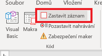 ...nebo přejdeme myší na kartu Vývojář a tam v sekci Kód klikneme na Zastavit záznam. Obě akce mají stejný výsledek - makro se přestane nahrávat.