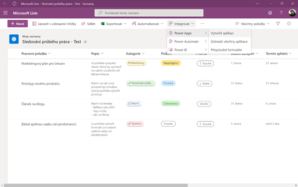 Hned vedle tlačítka pro zvolení automatizace seznamu je tlačítko pro integraci. Po jeho rozkliknutí se vám zobrazí tři možnosti - Power Apps, Power Automate a Power BI. Toto vám otevírá širokou škálu možností, jak se samotným seznamem pracovat. Například vizualizace dat ze seznamu nebo vytvoření aplikace.