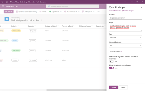 Pokud vám v šabloně chybí nějaký sloupec, můžete si ho sami vytvořit. Řekněme tedy, že chcete vědět, zda na daný úkol potřebuje nějaký člen týmu asistenci. Na konci tabulky je tlačítko Přidat sloupec. Po kliknutí na něj, se vám zobrazí volba několika kategorií, ze kterých můžeme vytvořit sloupec. V tomto případě je nejvhodnější kategorie Ano/Ne.