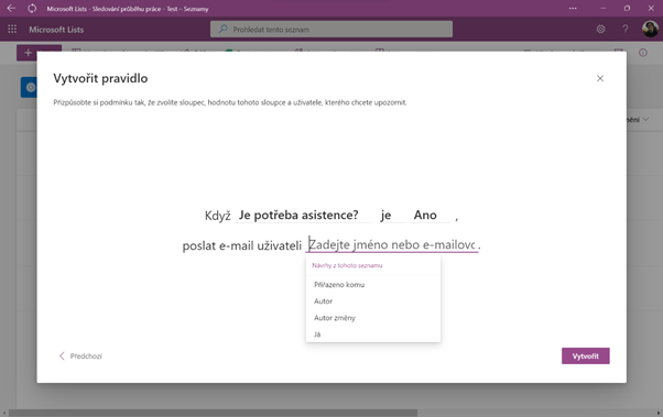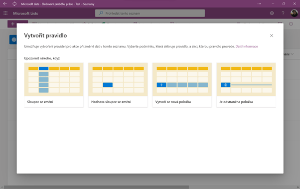 Pravidla fungují tak, že si vyberete, co se stane. V případě, že se jedna z těchto čtyř událostí stane, vaše pravidlo se spustí a pošle se e-mail s upozorněním. Například by se dalo vytvořit pravidlo, že když někdo potřebuje asistenci při úkolu, pošle se příslušnému člověku e-mail. Pro toto pravidlo zvolte druhou možnost Hodnota sloupce se změní.