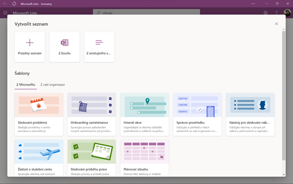 Pokud bychom chtěli vytvořit nový seznam v Lists, máme možnost si vybrat z několika šablon. Šablony jsou užitečné, pokud v aplikaci teprve začínáte, protože vám pomohou aplikaci sebejistěji ovládat. Proto dnes budeme pracovat s šablonou Sledování průběhu práce.