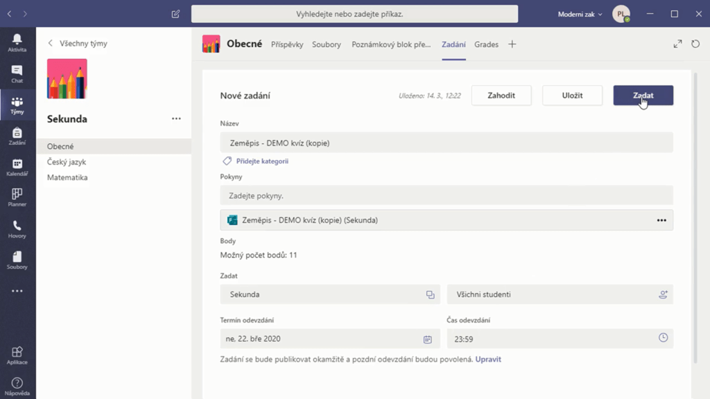 Druhá možnost je jako dělaná pro učitele a vede k vytvoření tzv. zadání v aplikaci Microsoft Teams, jehož součástí bude i tento kvíz. Zadání, jež bychom si mohli představit jako domácí úkoly, jsou dostupná pouze tehdy, máme-li vytvořený tým typu Třída. V něm je pak možné v kanálu Obecné nalézt v horní části kartu Zadání. Pokud do ní přejdeme, zobrazí se nám všechny již vytvořené úkoly, ale kromě toho také tlačítko Vytvořit. V jeho nabídce zvolíme Kvíz a vzápětí opět dostaneme na výběr, který z námi vytvořených kvízů chceme konkrétně zadat. Po potvrzení kvízu se nám v zadání automaticky předvyplní název, maximální počet bodů i pokyny. Stačí tedy jen nastavit termín odevzdání a můžeme vše potvrdit tlačítkem Zadat vpravo nahoře.