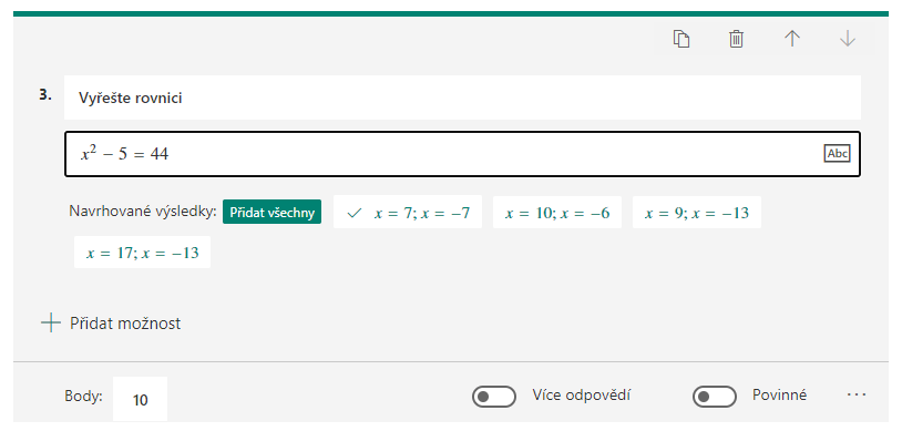 - Volba – student má zvolit jednu či více možností (tzv. uzavřená úloha); při vytváření odpovědí je nutné zakliknout u té, která je považována za správnou, fajfku vpravo; má-li být více možností správných, povolte přepínač Více odpovědí dole; pod nabídkou tří teček také můžete najít další šikovné nástroje jako Matematika, která přidá panel pro zadávání rovnic a výrazů