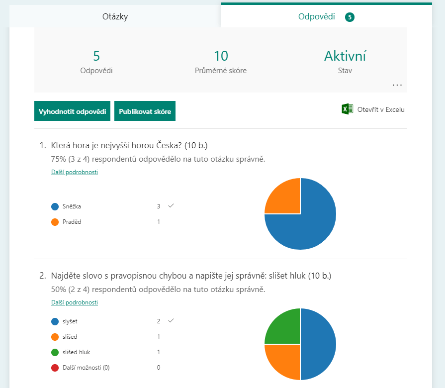 Jakmile učitelé zadají kvíz studentům tímto způsobem, mohou také na tomto místě, tedy v aplikaci Zadání, podrobně sledovat, kdo již kvíz vyplnil, kdo ještě ne, kolik za něj kdo získal bodů nebo i jak kdo přesně odpovídal otázku po otázce. Na všechna odevzdání se mohou dívat s tříděním buď podle osob, nebo podle otázek. A výsledky lze analyzovat souhrnně, např. průměrný čas vyplňování, průměrné skóre atd., přičemž všechny tyto informace si mohou exportovat do Excelu a pracovat s nimi dále.