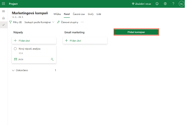 Jednotlivé úkoly si lze v rámci vašeho projektu také seřadit do více kategorií neboli takzvaných kontejnerů. Tyto kontejnery lze spravovat z kolonky panel. Po otevření této kolonky můžete vaše stávající kontejnery přejmenovat, vytvořit nové kontejnery a zařazovat do nich vaše úkoly.
