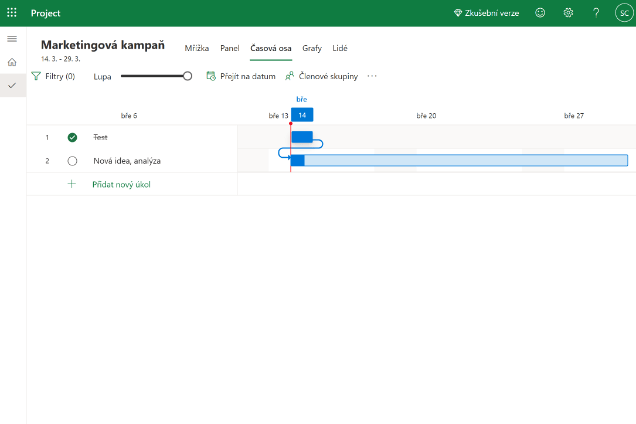 V kolonce časová osa můžete efektivně plánovat jednotlivé úkoly, ale i propojovat a vytvářet úkoly závislé na jiných úkolech. Toto je ideální pokud máte například například nějaký časový limit a potřebujete si termíny pro jednotlivé úkoly graficky vizualizovat.