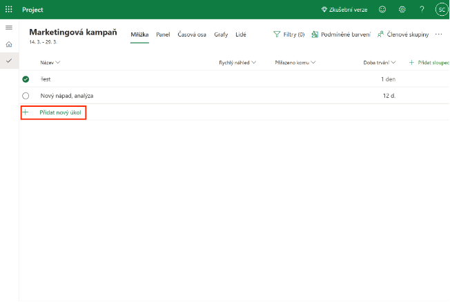 Nový úkol můžete vytvořit buď z kolonky mřížka nebo panel. Pro přidání nového úkolu klikněte na Přidat úkol a následně úkol pojmenujte, zvolte očekávané datum dokončení a případně ho přiřaďte vašemu spolupracujícímu.