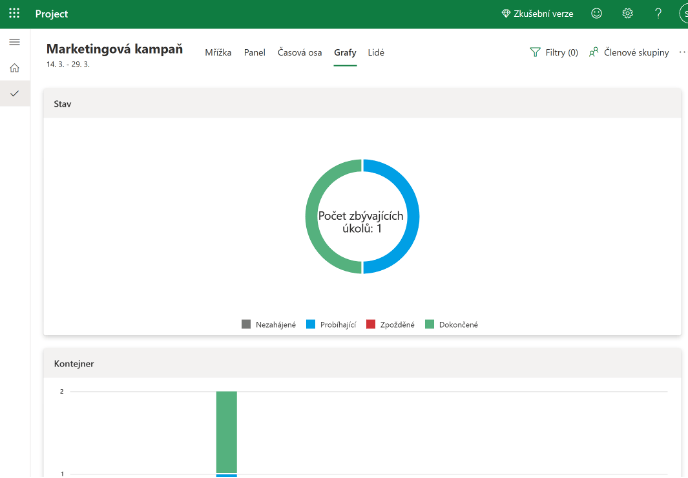 V kolonce grafy si můžete vizualizovat pokrok jednotlivých úkolů různých částí vašeho projetu. V kolonce lidé můžete Vašim kolegům a spolupracovníkům přiřadit úkoly a následně si zobrazit, jak každý z Vašich spolupracovníků postupuje.