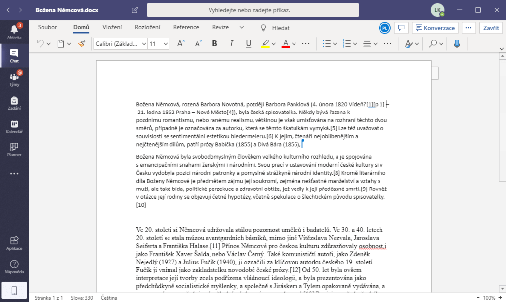 Při co-authoringu si mohou osoby ihned začít chatovat přímo ve Wordu, Excelu nebo v PowerPointu, a domluvit se tak třeba na dalším postupu nebo rozdělit si jednotlivé části souboru. To je možné přes tlačítko chatu vpravo nahoře na libovolném zařízení. Pozor! Neplést s tlačítkem Konverzace. Toto tlačítko nám otevře předešlou konverzaci v chatu v Teams. Objeví se na levé straně obrazovky a můžeme dál s danou osobou komunikovat. Jaký je tedy rozdíl? Tlačítko Konverzace použijeme v případě, že soubor nasdílíme do chatu v Teams, kde ho potom i s danou osobou upravujeme. Druhé tlačítko s ikonou prázdné zprávy použijeme v případě, že na souboru pracujeme s jakoukoliv další osobou, se kterou jsme se předtím nikdy přes Teams ani nemuseli bavit.