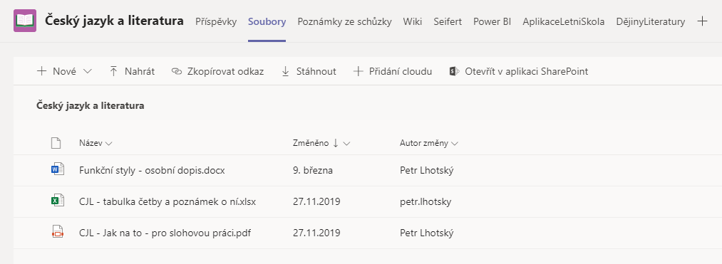 Co z toho tedy vyplývá? Všechny soubory v této složce mohou vidět členové našeho týmu nebo lidé, kteří mají odkaz. Každý člen týmu může také soubory upravovat (kromě zmiňovaných Výukových materiálů, ty studenti upravovat nemohou), nejen ty, které sám vytvořil. Nové soubory může každý tvořit a nahrávat. Zároveň mají všichni přístup do sdíleného prostředí v SharePointu.