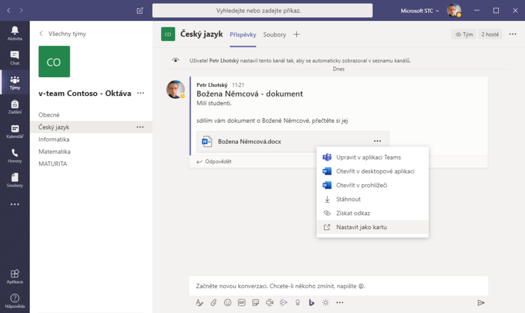 Důležité soubory lze připnout přímo mezi karty nahoru, aby je měli všichni stále na očích. Stačí u daného souboru kliknout na tři tečky (buď na kartě Příspěvky nebo ve složce Soubory) a zvolit možnost Nastavit jako kartu. Kromě souborů je možné do kanálů v Teams připnout mnohem více dalších aplikací, které se nám zrovna hodí, například sdílený poznámkový blok aplikace OneNote, o kterém si můžete přečíst v našem článku Poznámkový blok předmětu v aplikaci OneNote. Dále třeba webové stránky, sociální sítě, dotazníky atd. Stačí kliknout na malé plus v horní liště a vyskočí na nás široká nabídka všeho, co můžeme do kanálu přidat. A že těch aplikací tedy je! Do Microsoft Teams implementovala svou aplikaci už i řada vývojářů třetích stran, jen vyzkoušet.