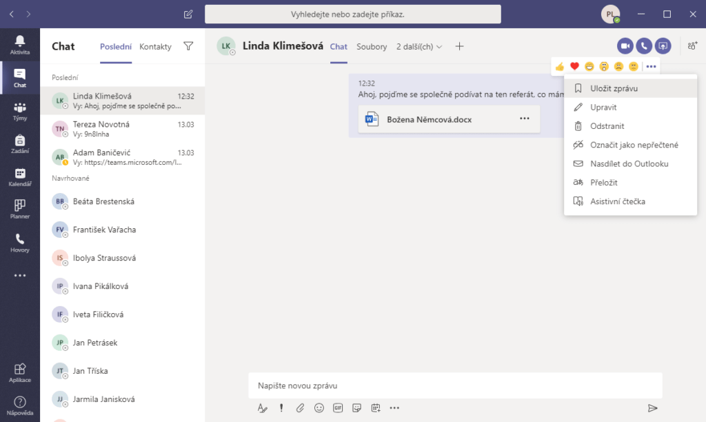 Stejná pravidla jako pro soubory v týmech platí i pro soubory v chatech. Chatovat, ať už ve dvojici nebo ve více lidech, můžeme s každým, i mimo náš tým. V chatu stejně jako v kanálech máme nahoře na liště kartu Soubory. Do ní mohou přistupovat všichni v chatu, jednotlivé soubory mohou přidávat, upravovat apod. Stránka ve službě SharePoint se v tomto případě nevytvoří, ale co-authoring je plně dostupný. Do chatu také můžeme posílat odkazy na soubory nebo soubory jako přílohy. A aby se nám zprávy s odkazy na soubory neztratily, můžeme je pomocí nabídky tří teček u konkrétní zprávy označit jako Důležité. Kolekci uložených zpráv potom nalezneme po kliknutí na náš profilový obrázek vpravo nahoře pod možností Uloženo. Takhle je to jednoduché.
