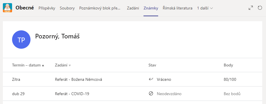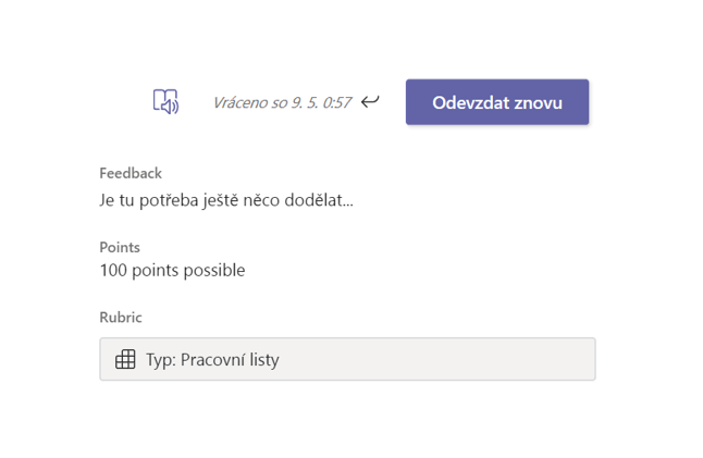 Kdykoli ti učitel úkol vrátí, zobrazí se ti u něj i hodnocení, ať už známka, body nebo slovní. O vrácení úkolu budeš informován/a na záložce Aktivita. Pokud ti jej vrátil ještě před uzávěrkou, pravděpodobně chce, abys ho ještě předělal/a, a mohl/a sis vylepšit hodnocení. Pokud ti jej ale vrátil až po uzávěrce, úkol už znovu odevzdat nemůžeš, a hodnocení, které u něj uvidíš, je proto finální. Známky či body ze všech zadání, tedy domácích úkolů i kvízů Microsoft Forms, si můžeš prohlédnout na kartě Známky.