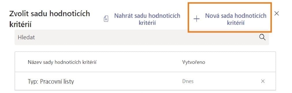 A teď ke známkám. Protože co by to bylo za úkol bez známek? Klikněte na Přidat sadu hodnotících kritérií. Hodnotící kritéria můžeme chápat jako stupnici známek ve škole. Buď můžete zvolit již vytvořené hodnocení (většina dat v Teams je využitelná znovu), nebo můžete vytvořit nové. Vytvářet známky začněte kliknutím na tlačítko Nová sada hodnotících kritérií vpravo.