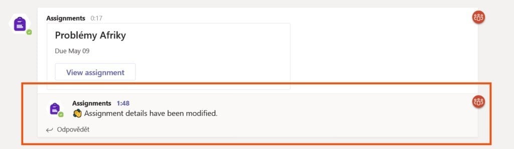 - V příspěvcích týmu – Jakmile učitel zadá úkol, automaticky se o tom do kanálu Obecné pošle nepřehlédnutelný příspěvek.