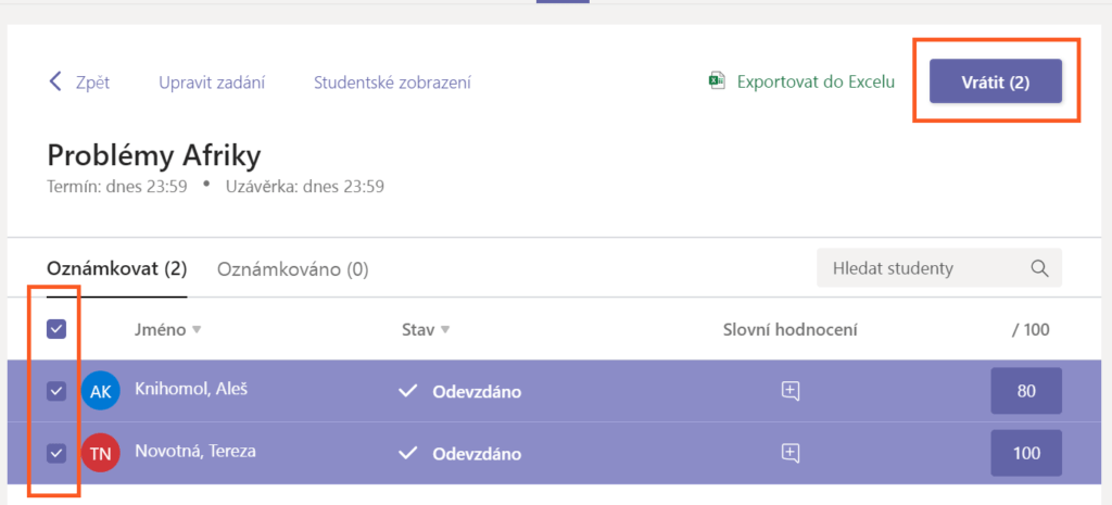 Pokud chcete poslat všem studentům hodnocení naráz, lze postupovat následovně. Práci každého studenta nejprve ohodnoťte, přičemž vždy klikněte nahoře na Zavřít. Tím se každé jednotlivé hodnocení uložilo, ale zatím se nevrátilo studentům. Z předchozí poznámky víte, že byste měli počkat, dokud nedoběhne koncové datum, jenom tak pošlete studentům finální hodnocení a oni nebudou moci vypracování jakkoli upravovat. V seznamu studentů u úkolu označte všechny studenty kliknutím na zaškrtávací políčko vedle záhlaví Jméno a pak zvolte zvýrazněné tlačítko Vrátit. A je to, úkoly se zároveň přesunou do sekce Oznámkováno.