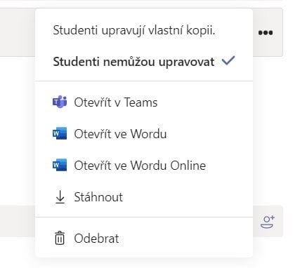 Jakmile budete mít vybrané všechny soubory, klikněte na zvýrazněné tlačítko Hotovo a budou přiloženy. U souboru je možné nastavit, jestli jej studenti budou moci upravovat, či nikoliv. Klikněte na tři tečky u přiloženého souboru a zobrazí se nabídka.