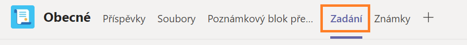 - Na kartě Zadání – Ta je dostupná z horního panelu kanálu Obecné v konkrétním týmu, podobně jako Příspěvky či Soubory.