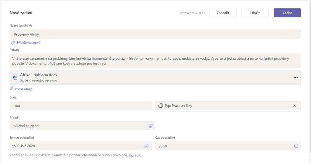 - Termín odevzdání – den a čas, kdy by studenti měli úkol odevzdat, ale když ho v tomto termínu neodevzdají, tak se skoro nic nestane a u odevzdaného úkolu bude pouze svítit vykřičník; vám se zobrazí informace, že studenti odevzdali úkol pozdě