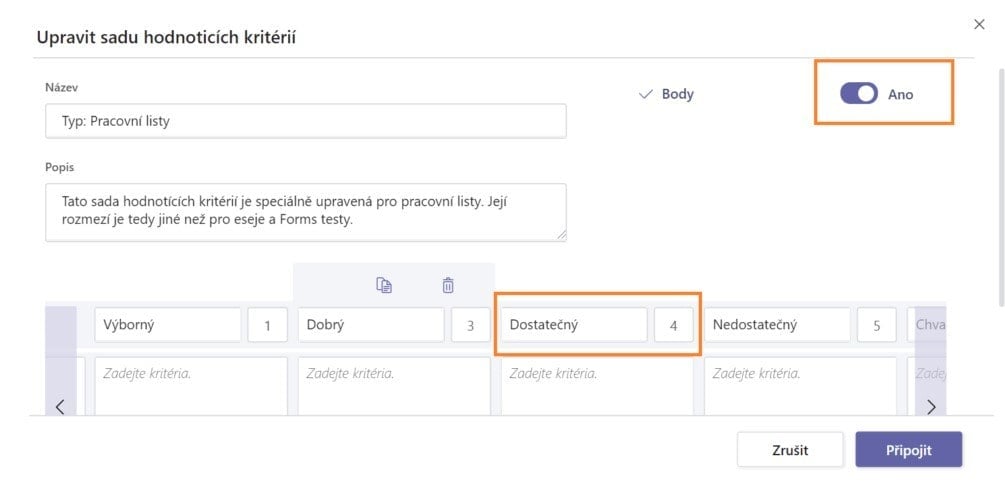 Až vše vyplníte, klikněte na zvýrazněné tlačítko Připojit. Velkou výhodou je, že podmínky, kterých mají dostát, uvidí i studenti. Pokud vytváříte kvíz, celé vytváření sady hodnotících kritérií můžete přeskočit, jelikož se body nastaví automaticky podle kvízu.