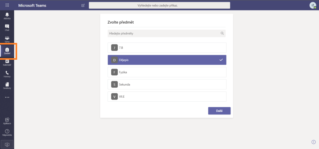 - Na záložce Zadání – Ta je dostupná z levého sloupečku. Tady uvidíš všechny týmy, kterých jsi součástí. Kterýkoli z nich lze rozkliknout. Poté uvidíš všechny úkoly, které ti byly v určité třídě nebo v určitém předmětu zadány. Snad jich nemáš moc.