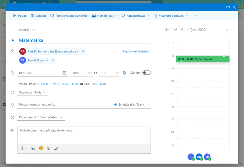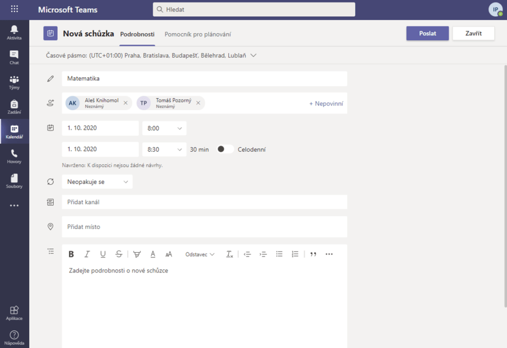Nezapomeňte na závěr kliknout na tlačítko Poslat vlevo nahoře, tím se hodina uloží do kalendáře vašeho a také všech účastníků.