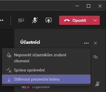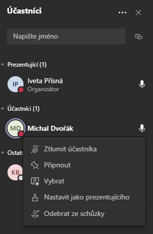 - Nastavit jako prezentujícího/Nastavit jako účastníka – Slouží pro přepínání rolí jednomu konkrétnímu účastníkovi. Například pokud zrovna nějaký student potřebuje prezentovat. Nenechávejte mu ale práva prezentujícího zbytečně dlouho.