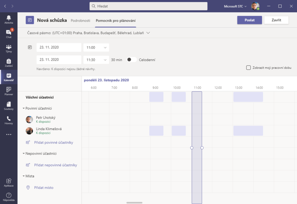 Na rozdíl od Outlooku zde sice je nesporná výhoda přidání kanálu, avšak zde nenajdeme Možnosti odpovědi, které umožňují nastavit potvrzování schůzky účastníky (tj. při plánování v Teams automaticky povoleno a nelze zakázat) a přeposílání schůzky dalším lidem (tj. při plánování v Teams také automaticky povoleno a nelze zakázat). Také zde nenajdeme výběr, jak dlouho před konáním online schůzky mají být účastníci upozorněni, tj. zde automaticky nastaveno na 15 minut. Nezapomeňte na závěr kliknout na tlačítko Poslat vpravo nahoře, tím se hodina uloží do kalendáře vašeho a také všech účastníků. V případě, že jste přidali kanál, se zobrazí také v něm, ovšem to už se dostáváme k dalšímu tématu, opět ukážeme z pohledu Outlooku i Teams.