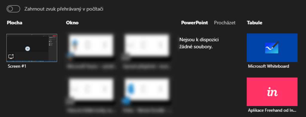 My teď ale půjdeme dále a řekneme si, jak na sdílení obrazu a zvuku, které najdete hned vedle tlačítka pro opuštění hovoru pod ikonou obdélníku se šipkou. Zde si můžete vybrat, které okno, prezentaci či plochu chcete sdílet pro své účastníky a zda chcete sdílet i zvuk z počítače, to znamená, že pokud pustíte video u sebe v počítači během hodiny, studenti uslyší i zvuk videa. Nemusíte sdílet hned celou plochu, aby účastníci náhodou neviděli něco jiného, než by měli. Můžete sdílet i pouze konkrétní okno jediné aplikace. Pokud využijete možnost PowerPoint, účastníkům se zobrazí prezentace v takovém režimu, že si ji budou moci u sebe sami posouvat. Užitečná je v tomto výběru i integrace Microsoft Whiteboard, tedy digitální tabule. Tu lze využívat jak v této verzi integrované v Teams, kdy lze nastavit, zda chcete, či nikoli, aby studenti mohli na tabuli také psát, tak také jako samostatnou aplikaci. Pro tyto účely určitě doporučujeme články Novinky a tipy pro studenty i učitele – září 2020, kde se dozvíte o možnostech spolupráce, a Whiteboard ve výuce, který pojednává o Whiteboard jakožto samostatné aplikaci pro Windows 10.