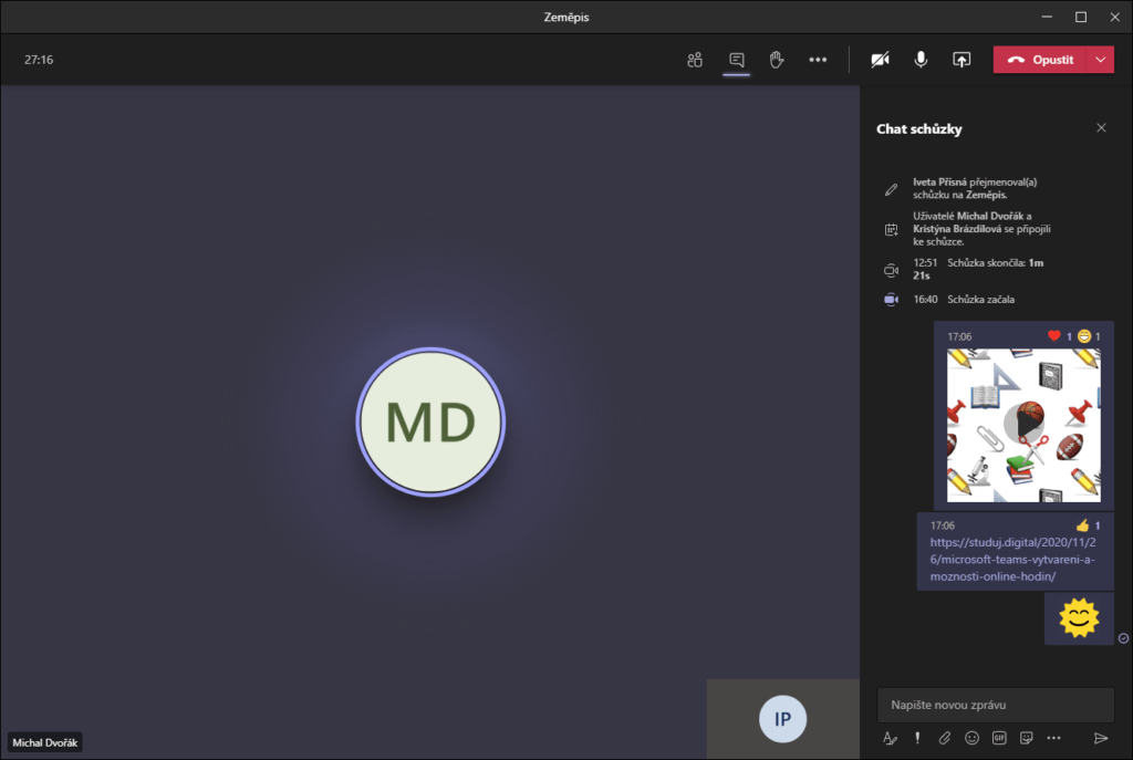 Jak si online schůzku ještě více zpestřit? Můžete využít chat, který je zde zabudovaný nejen proto, aby ho mohli využít ti, kteří zrovna nemohou mluvit, ale také proto, abyste si tam navzájem mohli sdílet třeba odkazy na nějaké zajímavé zdroje, soubory a podobně. A pokud chcete mít hodinu opravdu hravou, lze zde posílat samolepky, GIFy i nákresy, reagovat na ně pomocí smajlíků a srdíček a tak dále. Fantazii se meze nekladou a věřte mi, že hlavně žáci na prvním stupni toto zcela určitě ocení.