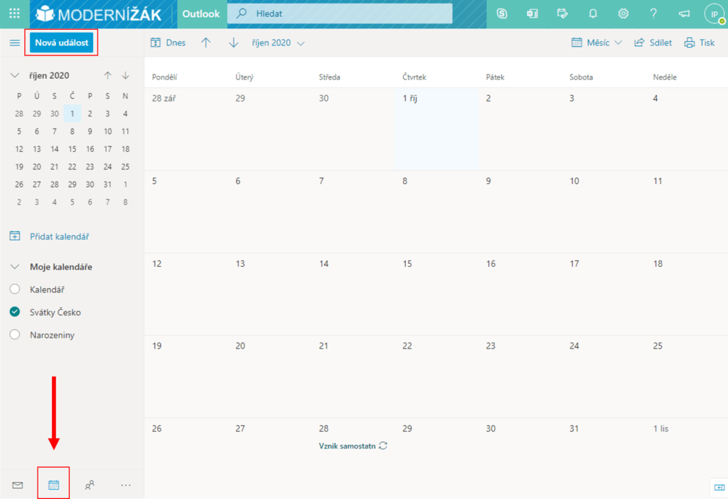 Pokud pro plánování online hodin chcete využívat Outlook, nejdříve si ukážeme, jak vytvořit schůzku v něm. Nejprve si otevřete váš Outlook, například z Portálu Office na adrese office.com. V rámci aplikace Outlook přejděte v levém dolním rohu do části Kalendář, kde se objeví vaše online hodiny i ostatní schůzky a naplánované akce. Přímá adresa je outlook.office.com/calendar.
