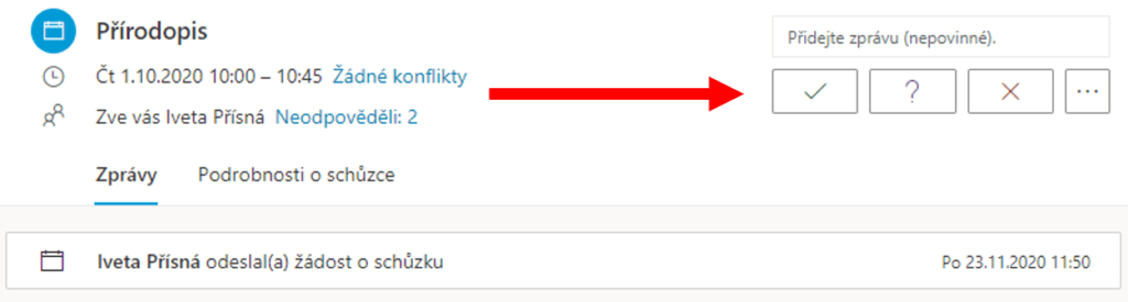 - Požadovat odpovědi – necháte-li ji povolenou, studenti budou mít v pozvánce možnosti schůzku přijmout, či odmítnout