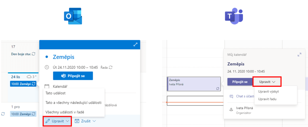 Jestliže jde o online hodinu, která má nastavené opakování, tlačítko Upravit vám dá na výběr, zda chcete upravit tzv. výskyt, tedy tuto jednu konkrétní událost, nebo řadu, tedy všechna opakování této události. Pokud chcete online hodinu odebrat, v Outlooku naleznete hned vedle tohoto tlačítka také Zrušit, případně v Teams naleznete tuto možnost v levém horním rohu formuláře při úpravě schůzky. Příjemný je také fakt, že schůzku vytvořenou v Teams lze upravovat i v Outlooku a naopak. To je propojenost!