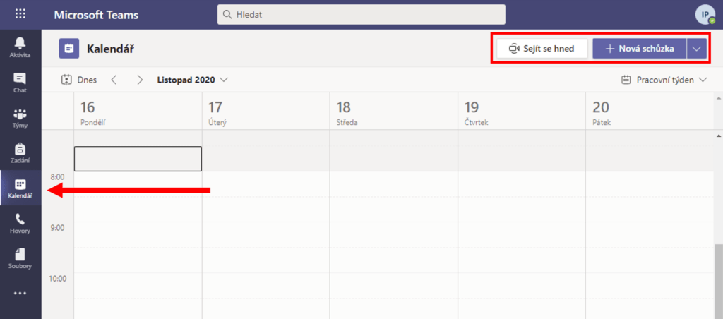 Jak naplánovat online hodinu přímo v aplikaci Teams? Má to nějaké výhody či naopak nevýhody oproti plánování přes Outlook? Začněme pěkně od začátku. V levém panelu zvolte Kalendář. Ve chvíli, kdy se nacházíte v rozhraní kalendáře, máte v pravém horním rohu možnosti Sejít se hned a Nová schůzka. Obě tlačítka jsou pro vytváření schůzek, tedy online hodin, velmi důležitá.