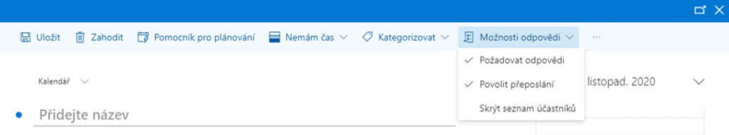 Mezi pokročilejší funkce patří několik možností v horní liště při tvorbě schůzky. Hlavní z nich je Možnosti odpovědi, tedy zda chcete, aby účastníci schůzky měli možnost odpovědět, zda se zúčastní, či nikoli. Tohle vám může pomoci především v situacích, kdy chystáte schůzku pro neznámé účastníky nebo nějaké mimořádné doučování, abyste dopředu zjistili, kolik lidí se připojí.