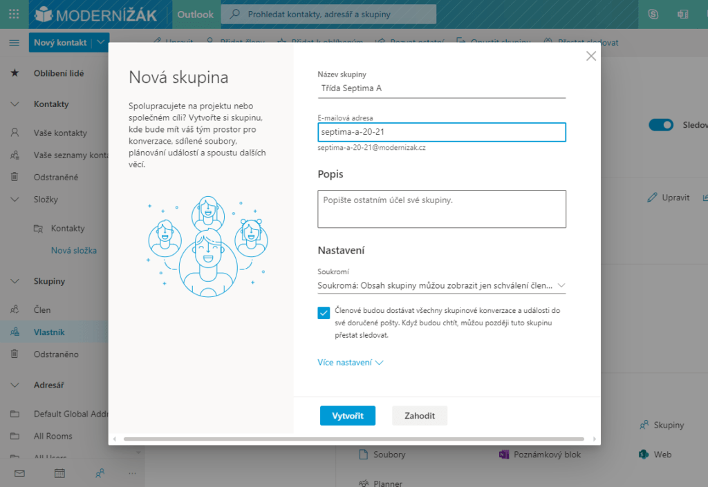Nejprve je zapotřebí se v rámci aplikace Outlook přepnout do zobrazení Lidé. To uděláte opět prostřednictvím ikon v levém dolním rohu. Následně klikněte na šipku u tlačítka Nový kontakt a vyberte možnost Nová skupina. Poté se vám otevře okno, kde už můžete začít se založením nové skupiny, která bude mít mimochodem svou e-mailovou adresu. Po kliknutí na tlačítko Vytvořit přidejte členy, buď z již stávajících adresářů vaší organizace, z kontaktů v Outlooku nebo úplně nové adresy člena.