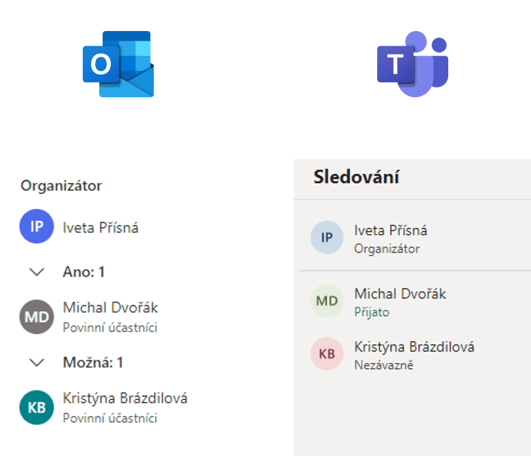 Jakmile někdo tato tlačítka použije, a odpoví tedy na vámi naplánovanou schůzku, uvidíte ve výpisu účastníků v Outlooku u dané pozvánky v e-mailu nebo schůzky v kalendáři lidi rozdělené na ty, které schůzku přijali, na ty, kteří u ní zvolili nezávaznou účast, a na ty, kteří ji úplně odmítli. Toto rozdělení, v podobě barev, můžete vidět také v aplikaci Teams. Ihned tak o tom máte přehled.