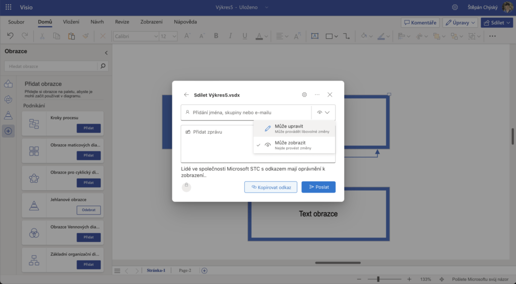 Také můžete k efektivnější spolupráci využít možnost komentářů. Stačí kliknutím vybrat nějaký obrazec a přidat komentář pomocí tlačítka Nový. Přidání komentáře umožní vašim spolupracovníkům odpovídat a na komentář reagovat.