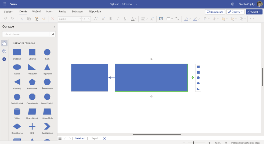 Pro přidání dalšího obrazce můžete opakovat stejný proces či využít možnosti automatického spojení nového obrazce s vámi vybraným pomocí šipky vedle daného obrazce. Další možností je obrazec vybrat a zkopírovat spolu se stejným rozsahem.