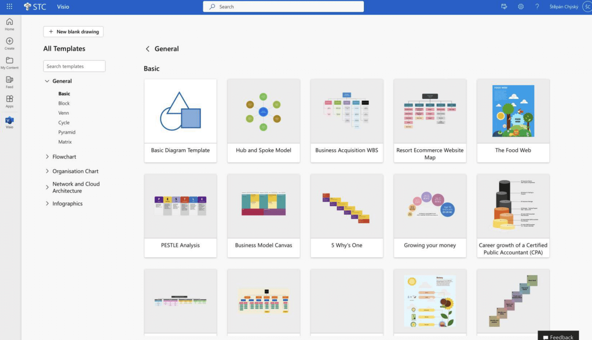 Po otevření Microsoft Visio si můžete vybrat z desítek šablon pro různé účely či vytvořit prázdný výkres, který si sami upravíte.