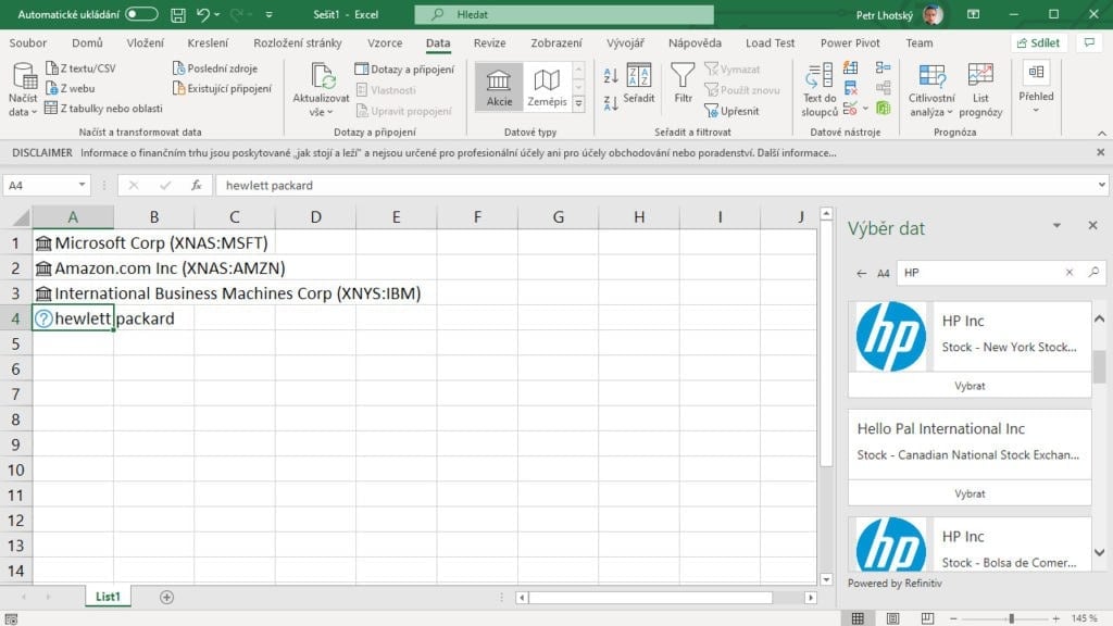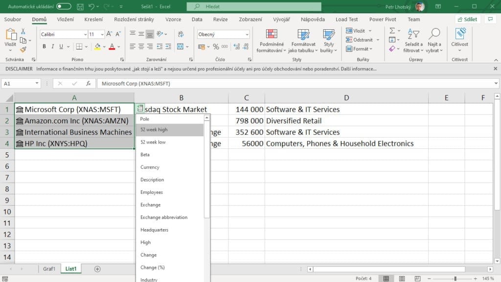 Vybereme datový typ Akcie. Excel nám automaticky naše vybrané buňky převede do formátu pro akcie a navíc automaticky doplní celé názvy firem, protože je vyhledal ve své rozsáhlé databázi. Můžeme si to zkontrolovat podle ikony vedle názvů firem. Pokud se vám ikona nezobrazí, můžete jednoduše označit buňku, kde se ikona neukázala, a vybrat firmu manuálně (na pravé straně obrazovky se vám otevře přehledná tabulka s návrhy firem, u nichž si Excel nebyl tak úplně jistý, viz. obrázek).